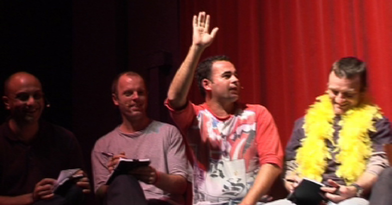 Akmal Saleh, Greg Fleet, Bob Franklin and Claire Hooper serve it up to Justin Morley.